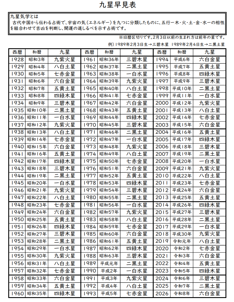 九星気学では立春(節分)で1年の区切りとなるため、1月1日~2月3日の生まれは、前年生まれとして扱います。